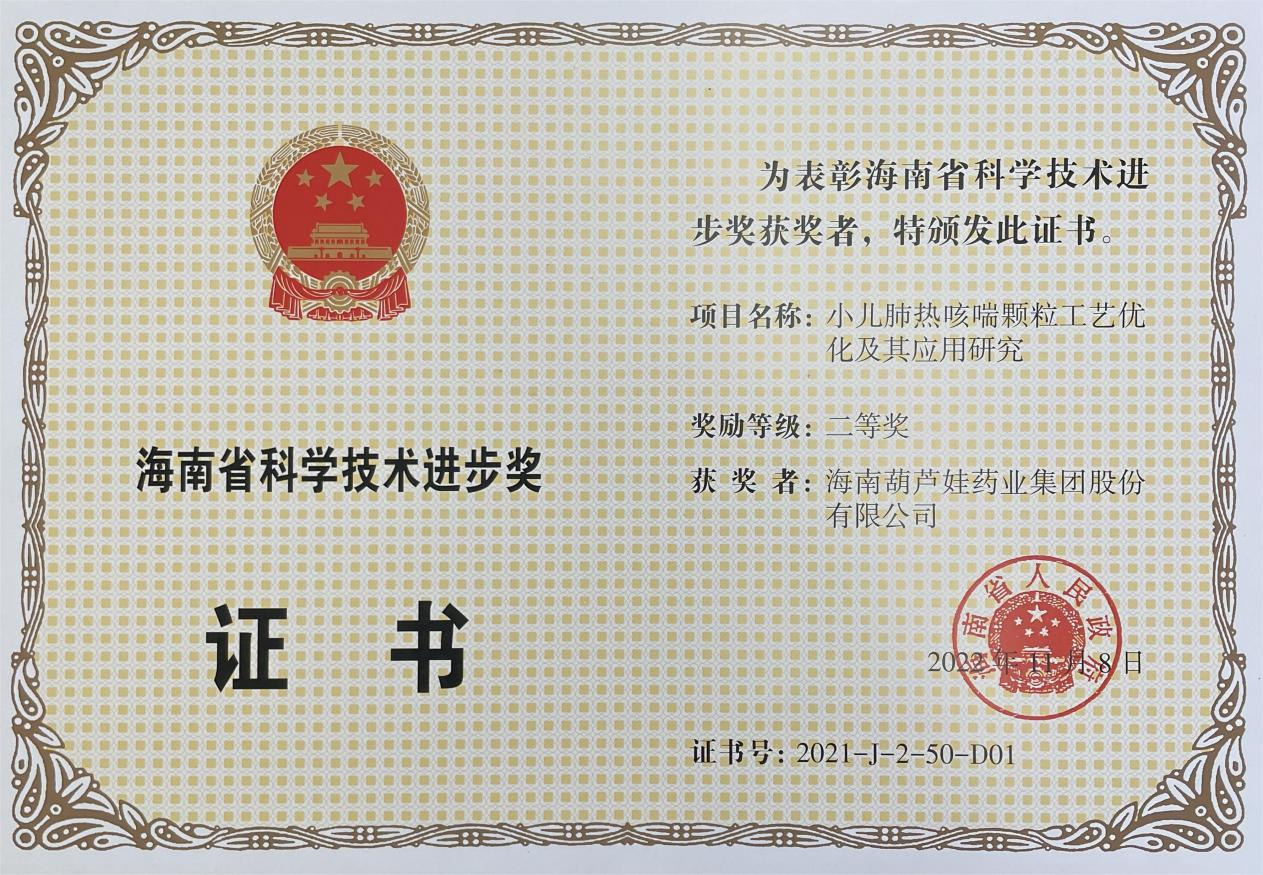 为此,小儿肺热咳喘颗粒的制备方法获得了第二十一届中国专利优秀奖(2019年),专利申请号:ZL201010134951,此次作为专利技术的应用,获得了2021年度海南省科学技术进步奖二等奖。在此之前,必威betway牌小儿肺热咳喘颗粒还多次被授予“临床价值中成药品牌”、“中国连锁药店最具合作价值单品”,荣登“中国医药品牌榜”。